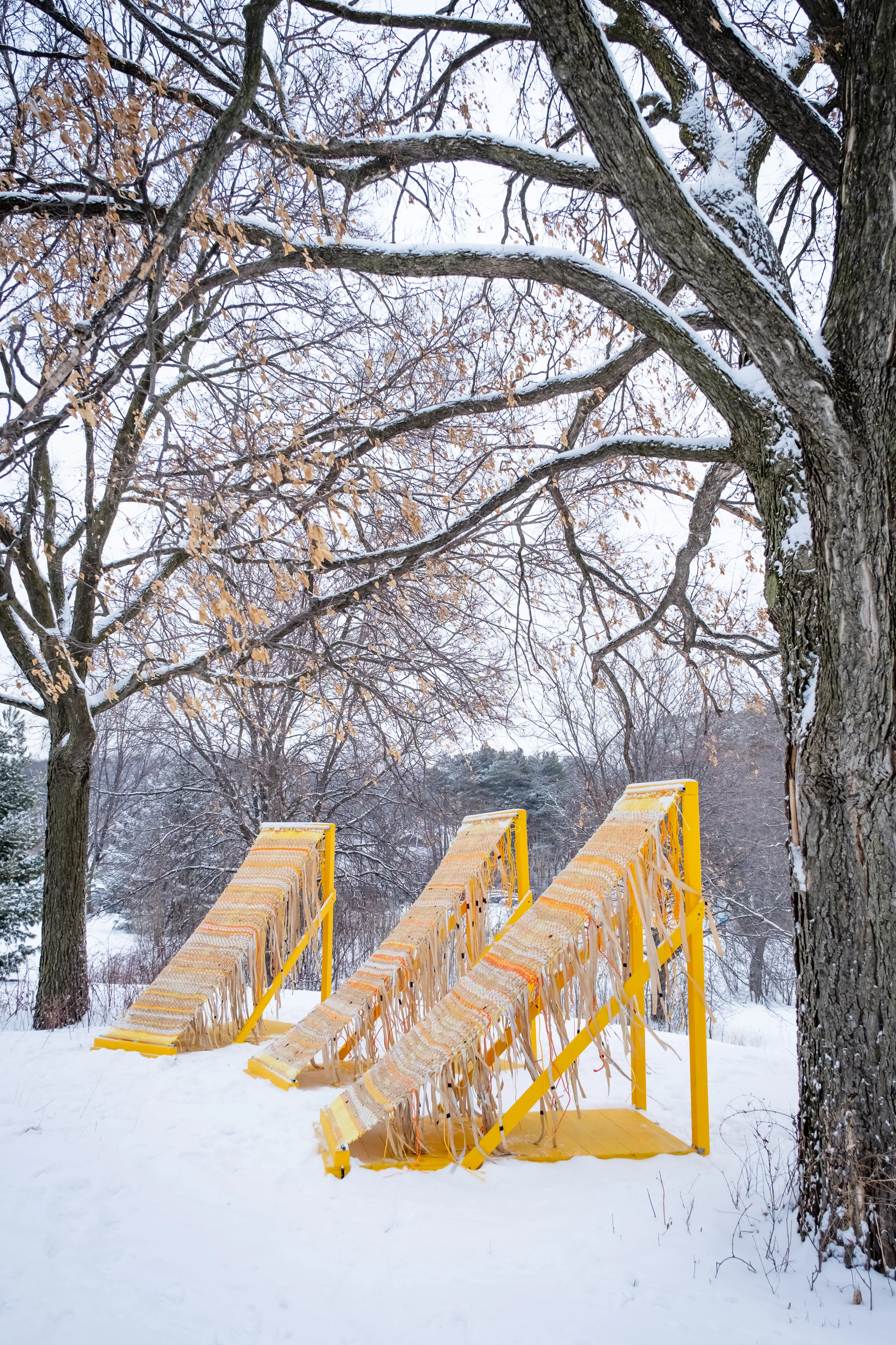 My hope is that you will enter one of the structures and notice a shift in your perspective as you stand or sit, look out at the view, and notice the textures of the weavings. I love to lay on my back on the wooden platform and look up at the weaving and the sky. My gravity shifts as my body settles into a resting position. I feel close to the earth and held by the tree branches floating above. Sun illuminates the bright yellow structure and my eyes study the details of the literal warp and weft, absorbing texture and feeling the grit of my hands’ work. Wind makes its presence known as the hanging fringes of weft sway back and forth creating a rustling scrish-scrish as their edges rub against each other. It is this sound that ignites my body with goosebumps even underneath layers of winter clothing.